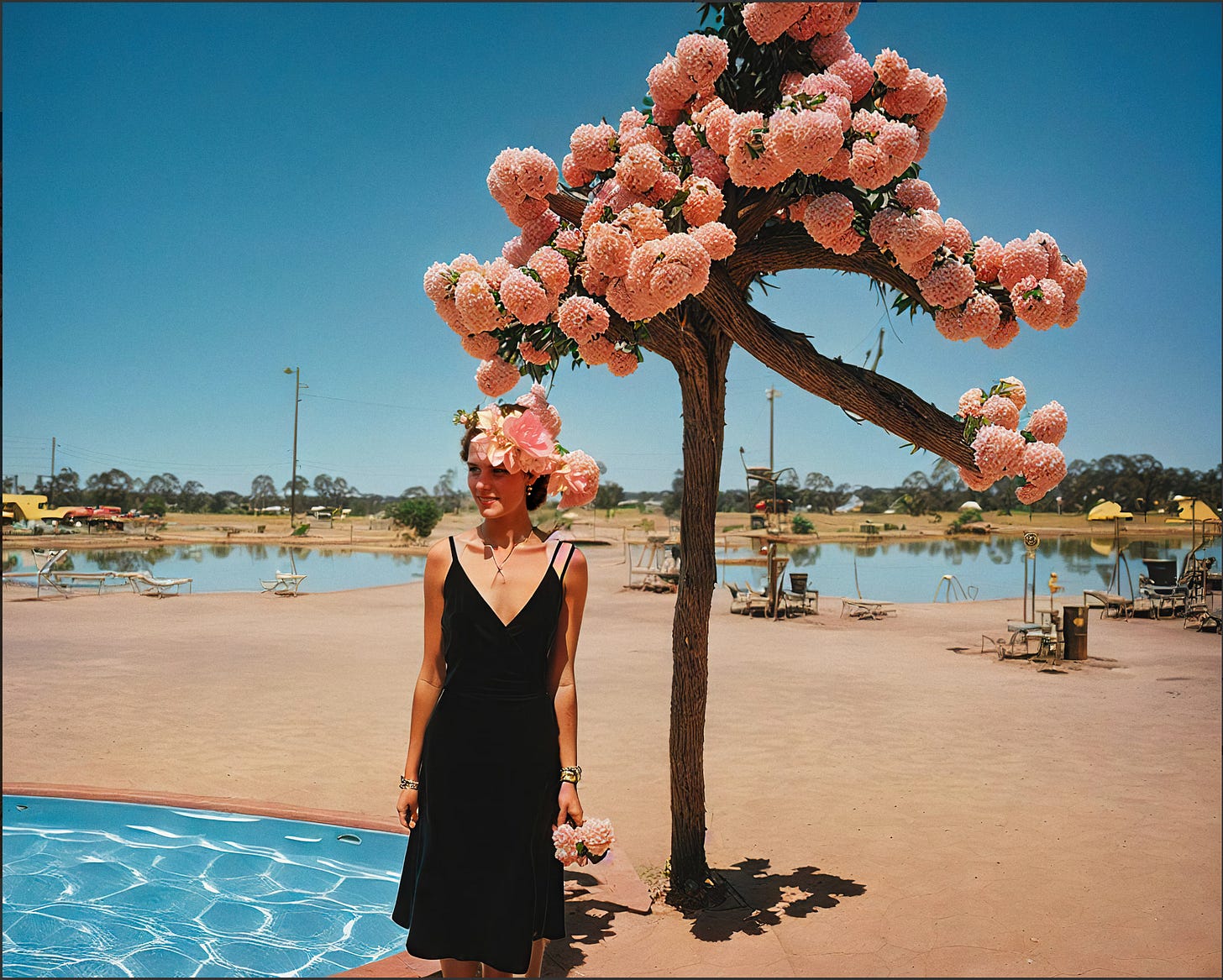 We also explored the mesmerizing work of Roope Rainisto, a prominent AI artist whose captivating desert scenes featuring cherry blossom-like flowers and pools of water leave us yearning for more. If you know where we can find this piece for purchase, please let us know!